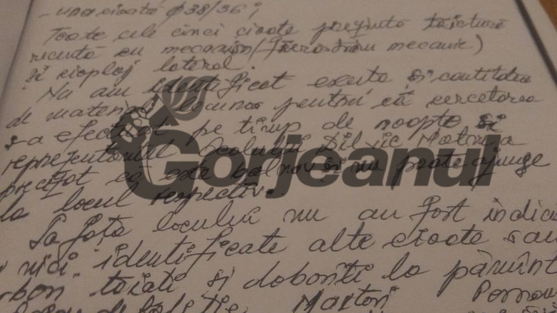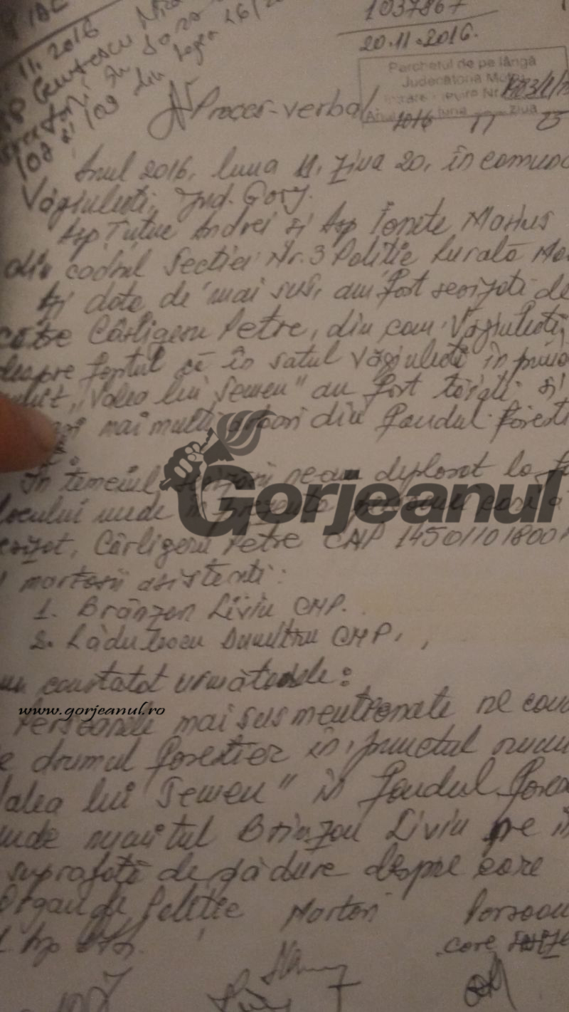 Cu această ocazie, la fața locului s-a încheiat un proces verbal, unde s-a menționat cum au fost duse lemnele, adică târâș din pădurea care nu aparținea primarului, s-a constatat în document existența cioatelor lângă cabană și chiar refuzul proprietarului de a permite măsurarea lemnelor. O filă din procesul verbal respectiv a dispărut însă de la dosarul penal aflat la Parchetul Motru.