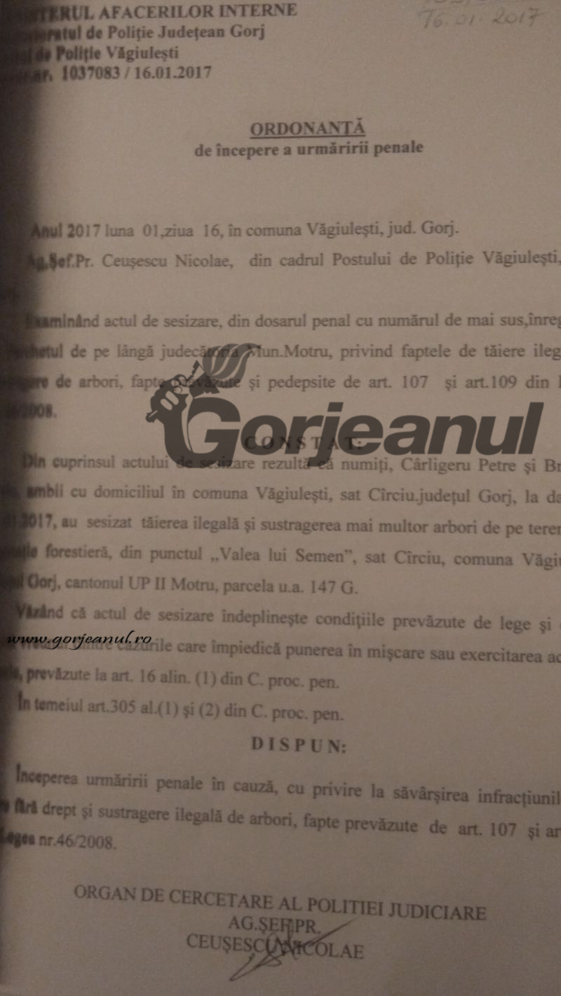 Denunțătorii s-au văzut obligați să sune la Poliția Motru și au sesizat acest lucru, a treia zi venind însă la fața locului agentul de poliție Daniel Diaconița. De data aceasta, la proprietatea primarului a ajuns și șeful postului de poliție din Văgiulești, Nicolae Ceușescu, și s-a încheiat un alt proces verbal unde s-a constatat că lemnele găsite în prima seară nu se mai aflau lângă cabană, ci fuseseră mutate la 200 de metri distanță, în mărăcini. Lemnele au fost măsurate de agentul de poliție Ceușescu. Despre anchetă, la solicitarea Gorjeanul, Ceușescu și-a adus aminte, ieri, parțial. A menționat doar că la ceva vreme după constituirea dosarului acesta a fost mutat la Poliția Rurală nr.3 Motru.
