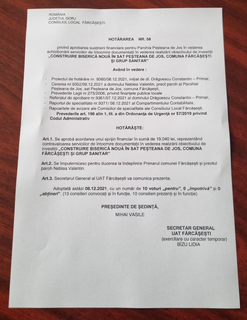 Consiliul Local Fărcășești, la inițiativa primarului Constantin Drăgoescu, a aprobat un prim ajutor financiar pentru viitorul lăcaș de cult din Peșteana de Joi.