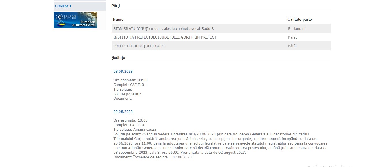 „Având în vedere Hotărârea nr.3/20.06.2023 prin care Adunarea Generală a Judecătorilor din cadrul Tribunalului Gorj a hotărât amânarea judecării cauzelor, cu excepţia celor urgente, conform anexei, începând cu data de 20.06.2023, ora 11.00, până la adoptarea unei soluţii legislative care să respecte statutul magistraţilor sau până la convocarea unei noi Adunări Generale a Judecătorilor care să decidă continuarea/încetarea protestului, amână judecarea cauzei la data de 08 septembrie 2023, sala 3, ora 09:00. Pronunţată la data de 02 august 2023”, potrivit deciziei Tribunalului Gorj.