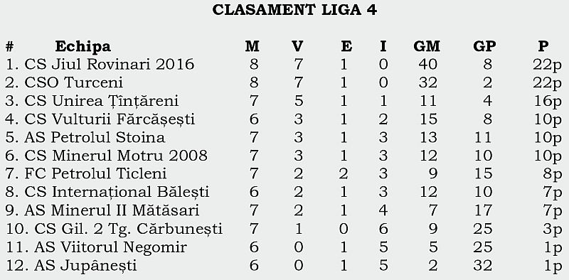 Doar golaverajul le separă pe formațiile din Rovinari și Turceni în fruntea Ligii a patra. Ocupantele primelor două poziții au rămas neînvinse și după rundă a opta, dar ambele au înregistrat primele remize din actualul sezon. Echipa lui Ion Lițoiu a făcut egal la Stoina, iar elevii lui Viorel Cojocaru au fost ținuți în șah la Țicleni. La ,,Onoare”, Ştiința Godinești rămâne singura echipa neînvinsă din cele două serii.