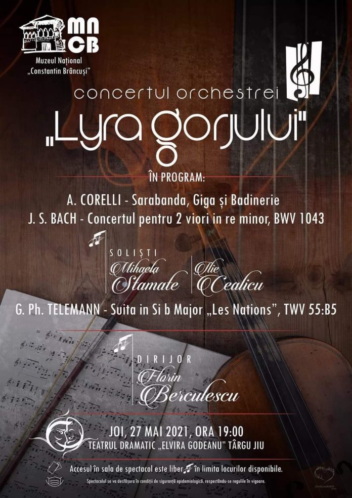 „Avem onoarea și bucuria să vă invităm la evenimentul ce va avea loc joi, 27 mai, ora 19,00, la Teatrul Dramatic „Elvira Godeanu” din Târgu Jiu. Vă așteptăm cu drag, să aprindem focul în sufletele noastre, alături de o instituție fanion a județului nostru – orchestra Lyra Gorjului”, transmite Muzeul Constantin Brâncuși.