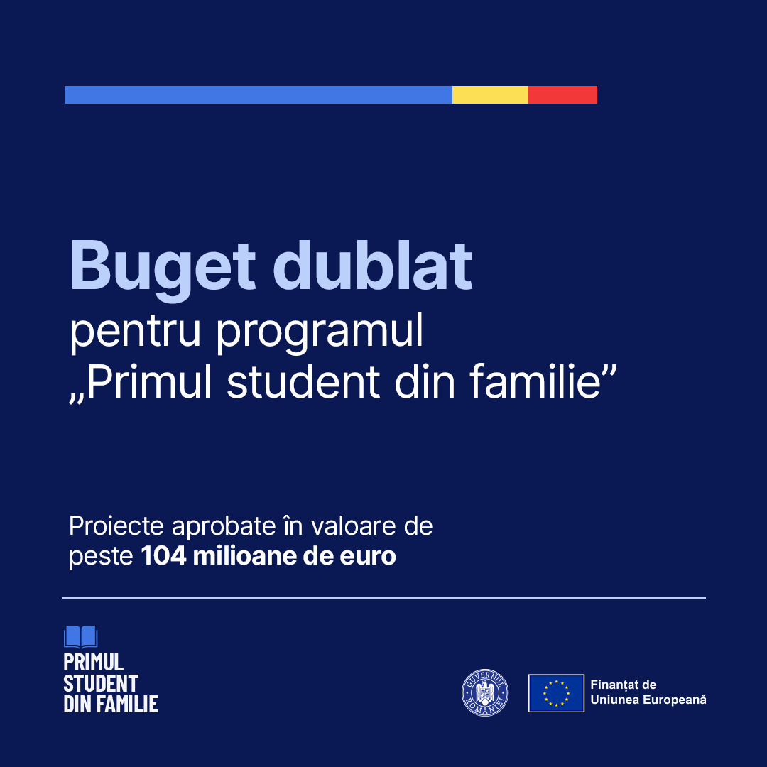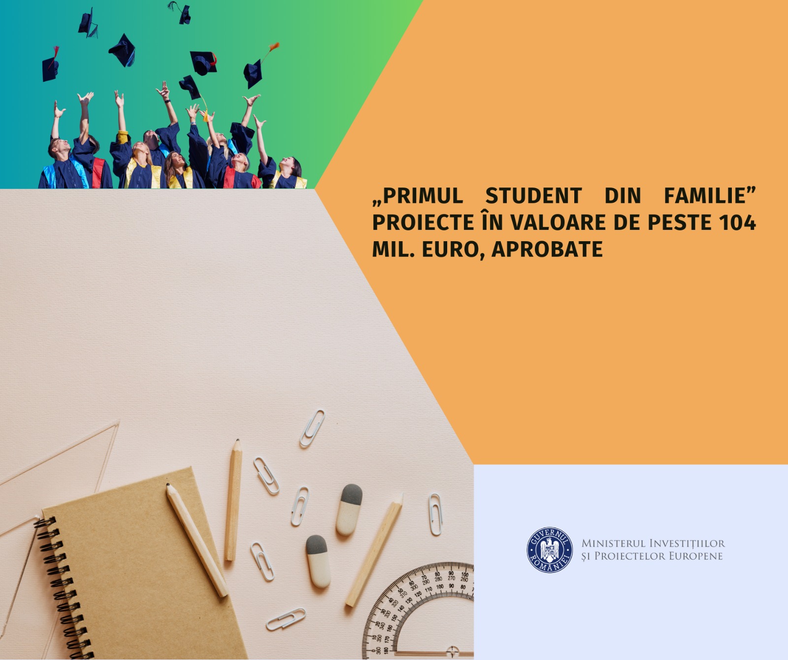 Ministerul Educației, în colaborare cu Ministerul Investițiilor și Proiectelor Europene, anunță aprobarea a 68 de proiecte în cadrul apelurilor „Primul student din familie”, finanțate prin Programul Educație și Ocupare. Valoarea totală a proiectelor depășește 104 milioane de euro, dintre care peste 103 milioane de euro sunt alocate regiunilor mai puțin dezvoltate, iar aproximativ 1,5 milioane de euro sunt destinate regiunii București-Ilfov.