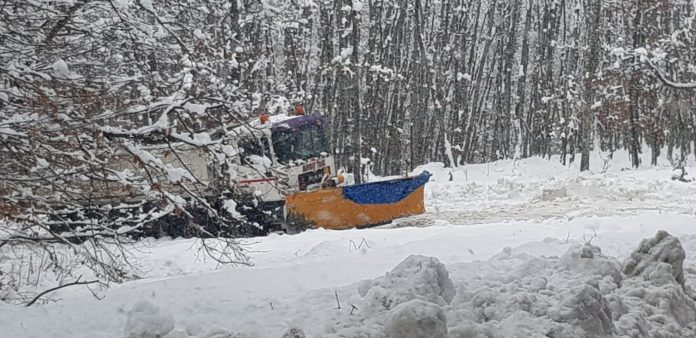 Abia la ora 16.00, pe drumul județean ce leagă comunele Licurici și Berlești și-a făcut apariția un utilaj de deszăpezire.