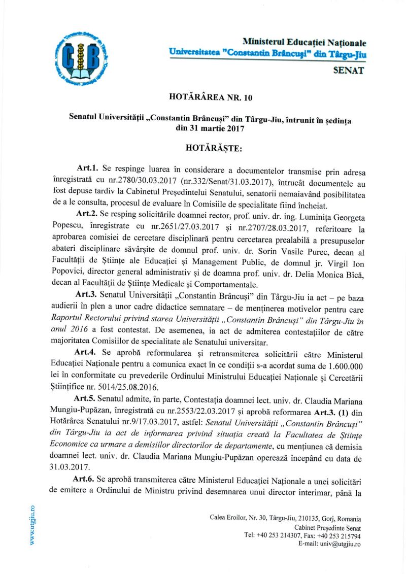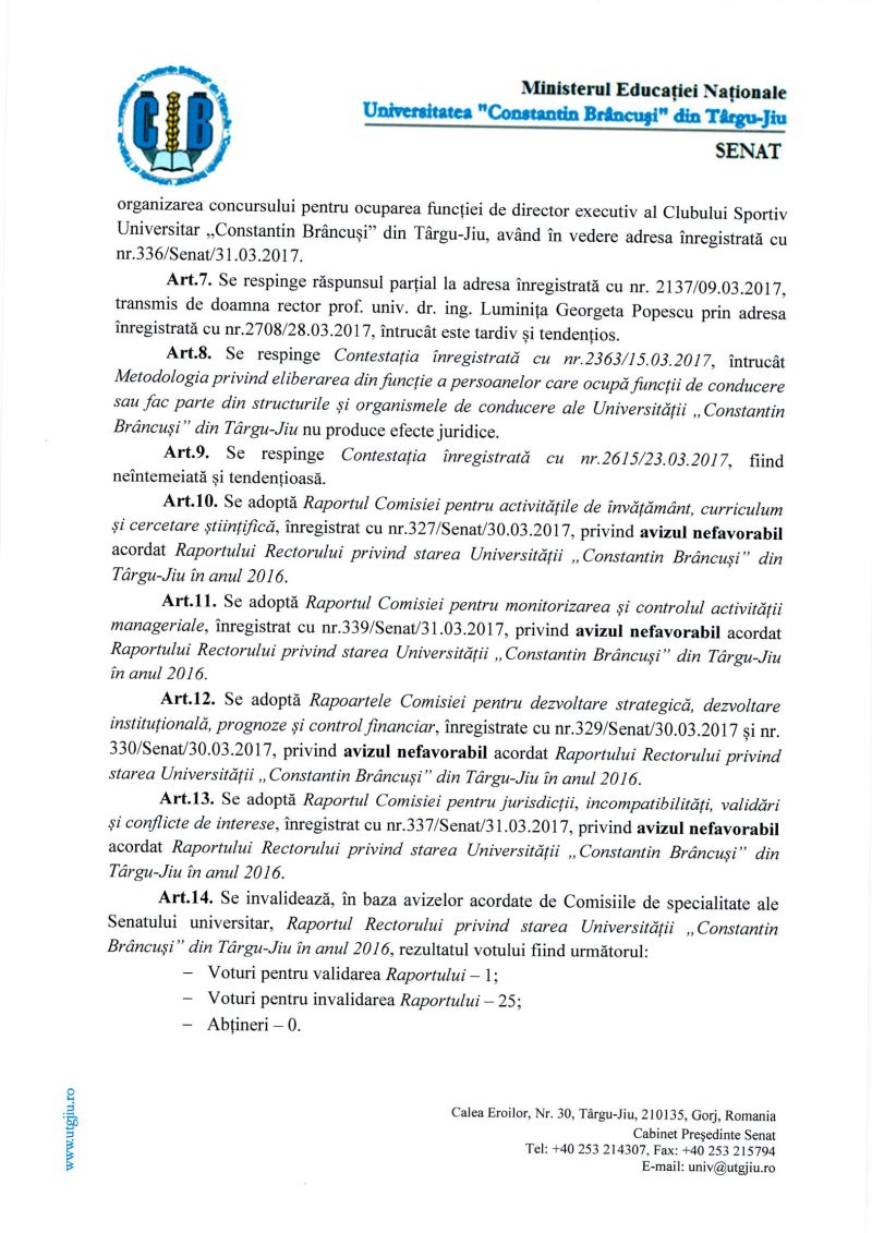 Senatul Universității “Constantin Brâncuși” din Târgu-Jiu a invalidat, în ședința din 31 martie, raportul rectorului Luminița Popescu, în legătură cu starea universității în anul 2016. De altfel, un singur membru al Senatului UCB a votat pentru validarea raportului, restul senatorilor dându-i un vot negativ documentului, după ce toate comisiile universității de stat i-au oferit acestuia, de asemenea, un aviz nefavorabil. Votul de blam oferit conducătorului instituției de învățământ ar fi trebuit să ducă la începerea procedurii de demitere a rectorului UCB, însă Luminița Popescu a oprit totul făcând contestație la demersul Senatului împotriva sa.