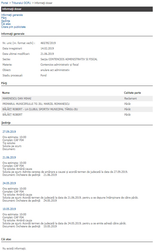 Marinescu cere anularea concursului din 5 februarie 2019, pe motiv că procedura de organizare a concursului nu a fost respectată. Consiliul Local al municipiului trebuia să organizeze concursul, susține Marinescu, nu primarul orașului. ,,Dacă Tribunalul Gorj îmi va da câștig de cauză, iar concursul va fi anulat cineva va trebui să plătească prejudiciul adus bugetului local, sportului gorjean și cetățenilor municipiului Târgu-Jiu”, a spus Marinescu.