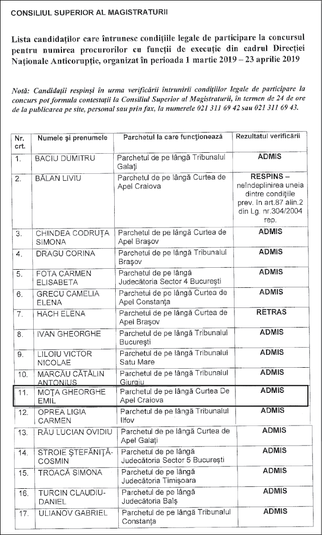 Concursul este organizat de Consiliul Superior al Magistraturii (CSM) pentru ocuparea unui număr de 31 de posturi de procuror, dintre care zece la structura centrală a DNA. CSM a anunțat că sunt 15 candidați care îndeplinesc condițiile legale de participare la concurs, între aceștia aflându-se și procurorul gorjean Emil Moța.
