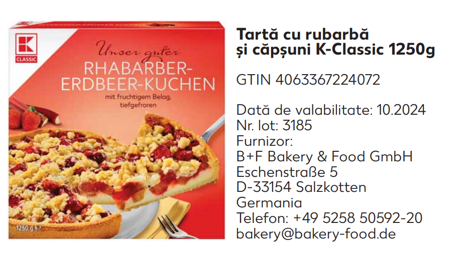 „B+F Bakery & Food GmbH informează asupra faptului că în cazul anumitor produse «Tartă cu rubarbă și căpşuni K-Classic» 1250 g pot exista bucăți mici de plastic albastru pe suprafața acestora. Clienții sunt rugați să returneze produsul cu datele de identificare de mai jos și vor primi contravaloarea acestuia”, a transmis ANSVSA.