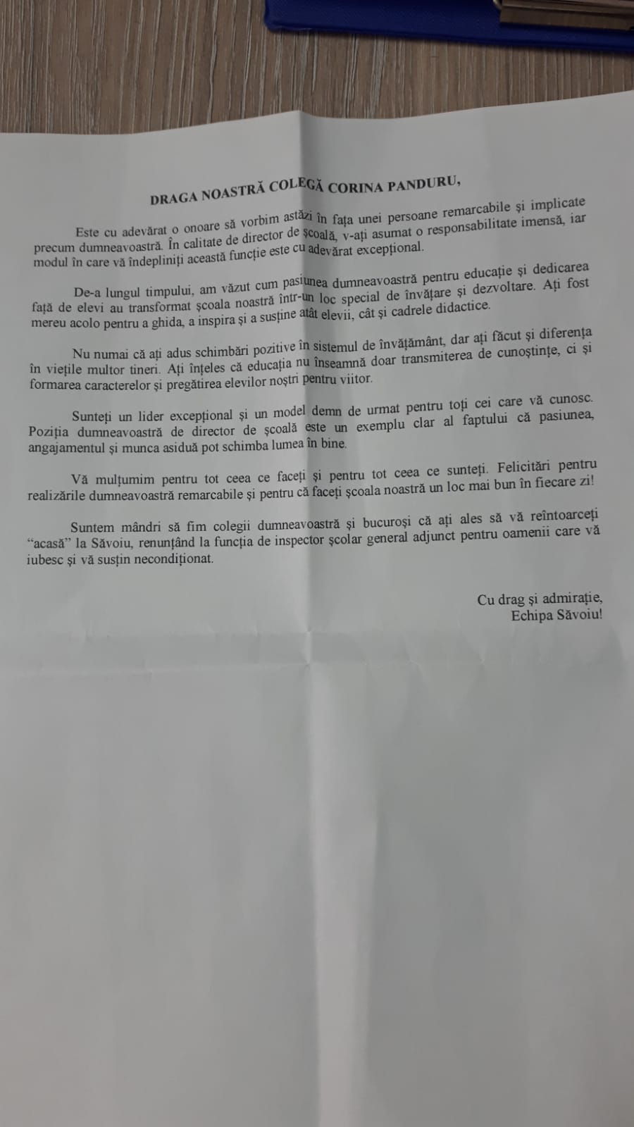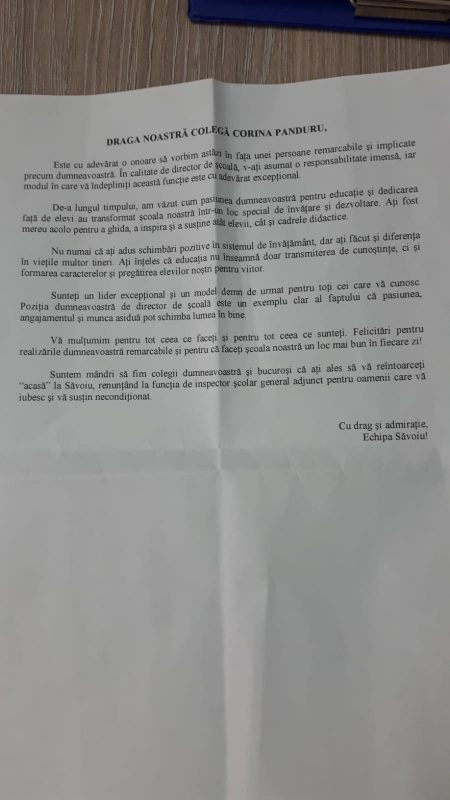 Colegii săi au felicitat-o pentru această alegere, mai ales că prof. Corina Panduru, așa cum a declarat în numeroase rânduri, iubește copiii și ceea ce face la ”Constantin Săvoiu”. De asemenea, este unul dintre cei mai apreciați și îndrăgiți directori de școală.