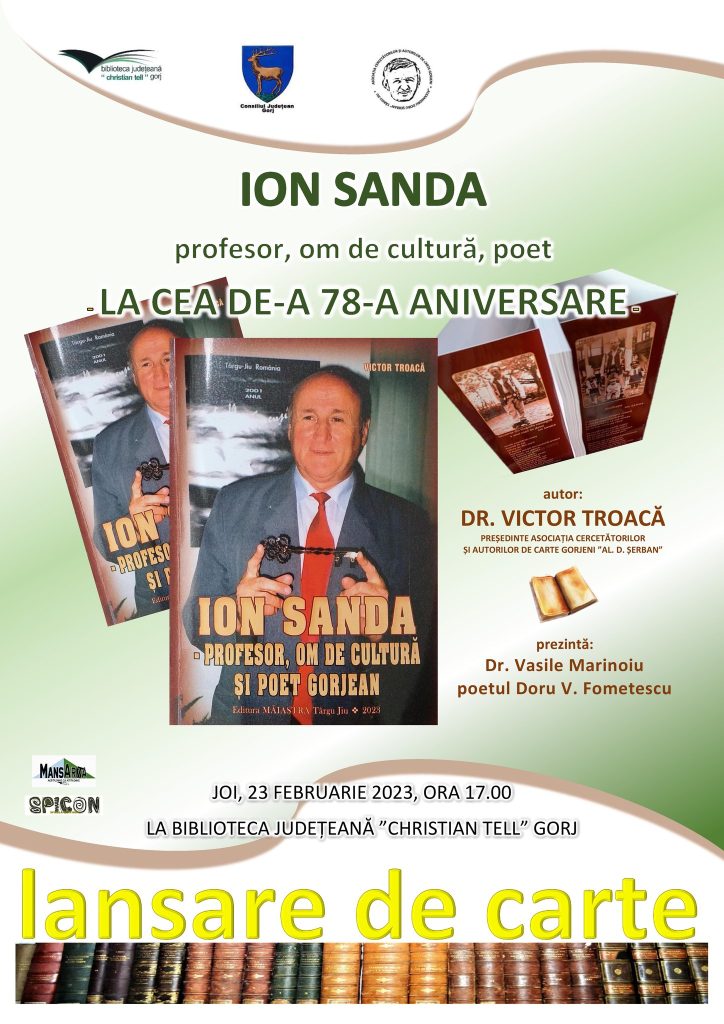 În după-amiaza zilei de joi, 23 februarie 2023, în MansARTA Bibliotecii Județene „Christian Tell” din Târgu Jiu, profesorul și omul de cultură al Gorjului, Ion Sanda, a fost sărbătorit, la împlinirea vârstei de 78 ani, de către familie, prietenii apropiați și iubitorii de carte gorjeni, care a constituit un bun prilej pentru lansarea volumului „ION SANDA – profesor, om de cultură și poet gorjean”, volum semnat de dr. Victor Troacă – președintele Asociației Cercetătorilor și Autorilor de Carte Gorjeni „Al. Doru ȘERBAN”.