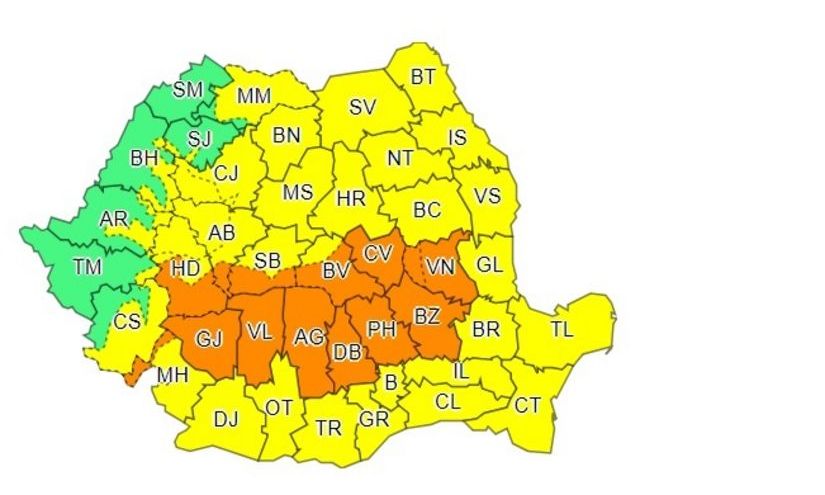 Meteorologii ANM au actualizat avertizările cod portocaliu şi cod galben. În următoarele ore vor fi ploi însemnate cantitativ, în special în jumătatea de nord a Olteniei și a Munteniei, în sudul Transilvaniei și zona Carpaților Meridionali și de Curbură. Un COD GALBEN este valabil pe 10 iulie, orele 10 – 21, fenomenele vizate fiind: instabilitate atmosferică accentuată și cantități însemnate de apă; în cea mai mare parte a țării, pe parcursul zilei de marți, 10 iulie vor fi perioade cu instabilitate atmosferică accentuată ce se va manifesta local prin averse cu caracter torențial, descărcări electrice frecvente, intensificări ale vântului ce vor lua și aspect de vijelie și izolat grindină. Prin cumulare sau în intervale scurte de timp se vor înregistra cantități de apă de 20…25 l/mp și izolat 40…50 l/mp. Începând de seara, aria ploilor va fi în restrângere către nord-est, iar pe timpul nopții de marți spre miercuri (10/11 iulie) în Moldova și zona Carpaților Orientali izolat se vor cumula 20…25 l/mp.
