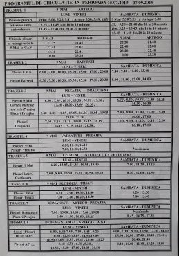 9 Mai – Vărsături – Preajba rămâne neschimbat. De asemenea, pe traseul 9 Mai – Iezureni – intersecție Curtișoara au fost eliminate trei curse, 9 Mai – Slobozia – Ursați a fost eliminată o cursă, Romanești – Artego – Preajba a fost eliminată o cursă, iar pe traseul Dedeman – 9 Mai – Artego – ANL, nu au fost efectuate modificări. Cursele eliminate de pe traseele laterale sunt cele utilizate de elevi în perioada anului școlar. Noul program de circulație va fi afișat în toate stațiile de urcare-coborâre, dar și în mijloacele de transport în comun.