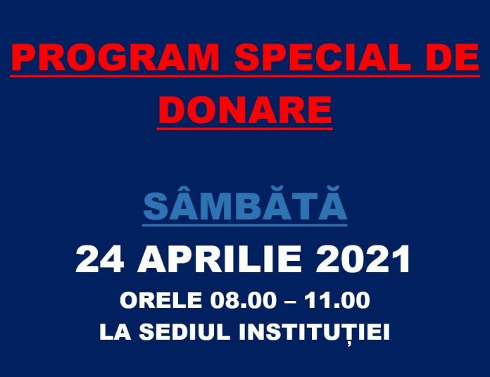 La finele săptămânii viitoare, Centrul de Transfuzie Sanguină organizează un nou program special de donare de sânge! Astfel, Centrul de Transfuzie Sanguină din municipiul Târgu-Jiu îi așteaptă pe 24 aprilie 2021, între orele 08.00-11.00, pe toți cei care doresc să doneze sânge, însă programul de lucru din timpul săptămânii nu le-a permis să doneze. „Donează sânge, fii generos! Sângele este o resursă națională; donarea de sânge este un act voluntar, anonim și neremunerat. Sâmbătă, 24 aprilie 2021, îi așteptăm pe toți cei care doresc să doneze sânge, la sediul nostru, între orele 08.00-11.00, mai ales pe cei pe care programul încărcat de lucru din timpul săptămânii i-a împiedicat să doneze”, au transmis organizatorii.