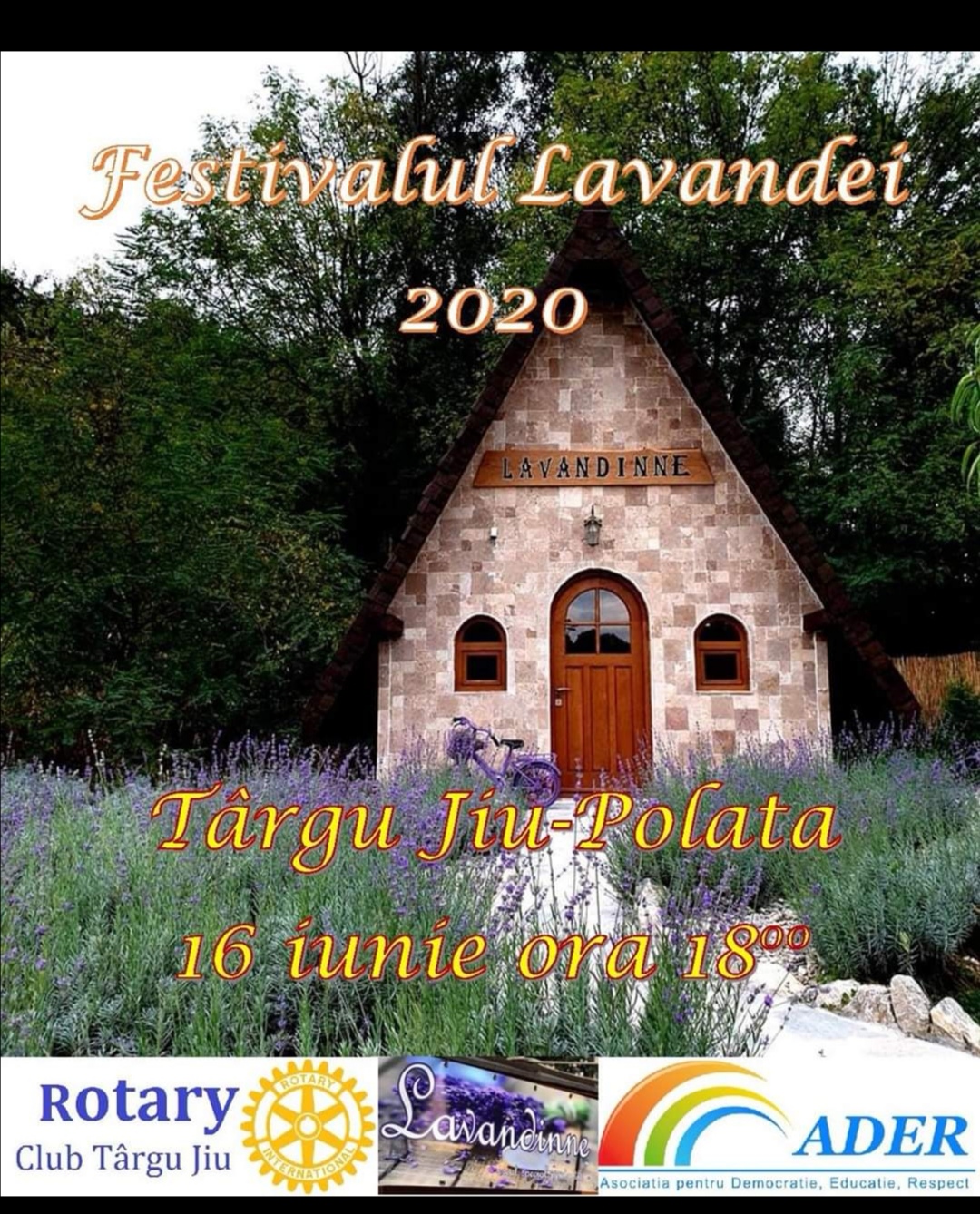 Clubul Rotary din Targu Jiu, în parteneriat cu Asociația pentru Democratie Educație Respect si Lavandinne o,rganizeaza mâine, 16 iunie 2020, ora 18:00, prima editie a Festivalului Lavandei. „Ne propunem sa incepem o serie de actiuni pentru sprijinirea antreprenorilor locali si profitând de frumusetea lavandei inflorite organizăm un eveniment deosebit, îmbinând muzica clasica cu frumusetea locului. Ai simțit vreodată mirosul câmpurilor de lavandă?
