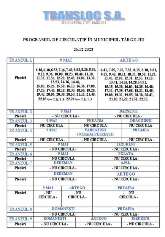 - cursele laterale nu circulă (9 Mai – Preajba – Drăgoeni, 9 Mai – Vărsături – Preajba, 9 Mai – Bârsești, 9 Mai – Iezureni, 9 Mai – Polata, Dedeman – ANL, Dedeman – ARTEGO, Romanești – Preajba, Romanești – ARTEGO – Iezureni),