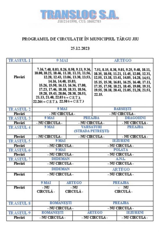 În prima și a doua zi de Crăciun (25 și 26 decembrie), se restrâng cursele mijloacelor de transport în comun ale TRANSLOC, după cum urmează: