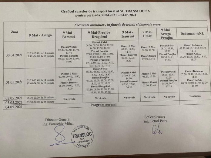 Programul mijloacelor de transport ale societății TRANSLOC Târgu Jiu în perioada Sărbătorilor Pascale va fi conform graficului atașat.