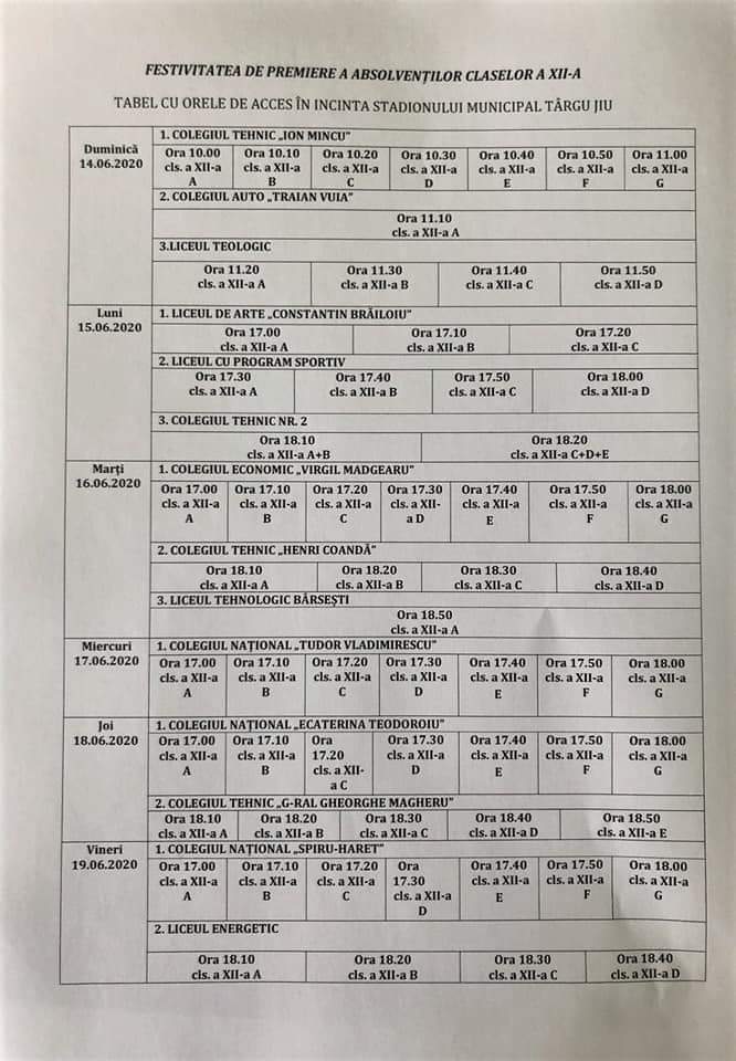 Programul festivităților de premiere pentru elevii de clasa a XII-a din Târgu Jiu