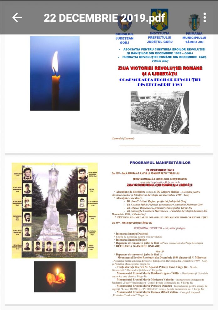 În imaginea alăturată se regăsește programul manifestărilor dedicate împlinirii a 30 de ani de la ZIUA VICTORIEI REVOLUȚIEI ROMÂNE ȘI A LIBERTĂȚII-COMEMORAREA EROILOR REVOLUŢIEI DIN DECEMBRIE 1989, care vor avea loc în data de 22 decembrie 2019, la Târgu Jiu în sediul Palatului Administrativ și în Piața Revoluției din centrul municipiului, începând cu ora 10.00.