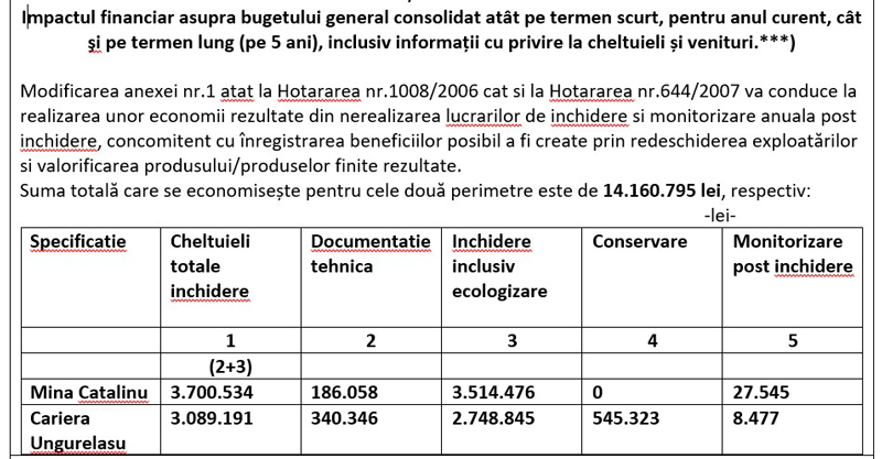 „Există două perimetre miniere cu rezervă omologată pentru grafit la Cătălinu și Ungurelașu, Baia de Fier, jud. Gorj. Aceste perimetre au fost aprobate la închidere definitivă și monitorizare a factorilor de mediu postînchidere prin Hotărârile de Guvern nr. 1008 din 2 august 2006 pentru perimetrul Cătălinu, respectiv 644 din 20 iunie 2007 pentru perimetrul Ungurelașu”, se arată în nota de fundamentare a actului normativ. La nivelul Comisiei Europene a fost revizuită politica industrială, identificându-se 137 de materii prime critice de care UE este dependentă ținând cont de obiectivele de mobilitate și decarbonizare. România deține o parte din aceste resurse care au fost exploatate în anii anteriori și care, din rațiuni economice, au fost aprobate la închidere și ecologizare. Grafitul face parte din această categorie. „Eliminarea poziției 51 din Anexa 1 Lista minelor și carierelor care se închid în etapa a IX-a, respectiv eliminarea poziției 48 din Anexa 1 Lista minelor și carierelor care se închid în etapa a IX-a, coroborat cu modificarea normelor de aplicare a Legii Minelor 85/2003 cu modificările și completările ulterioare, va crea posibilitatea redeschiderii acestor perimetre miniere și valorificarea superioară până la produs finit a acestui mineral”, mai arată proiectul de Hotărâre de Guvern.