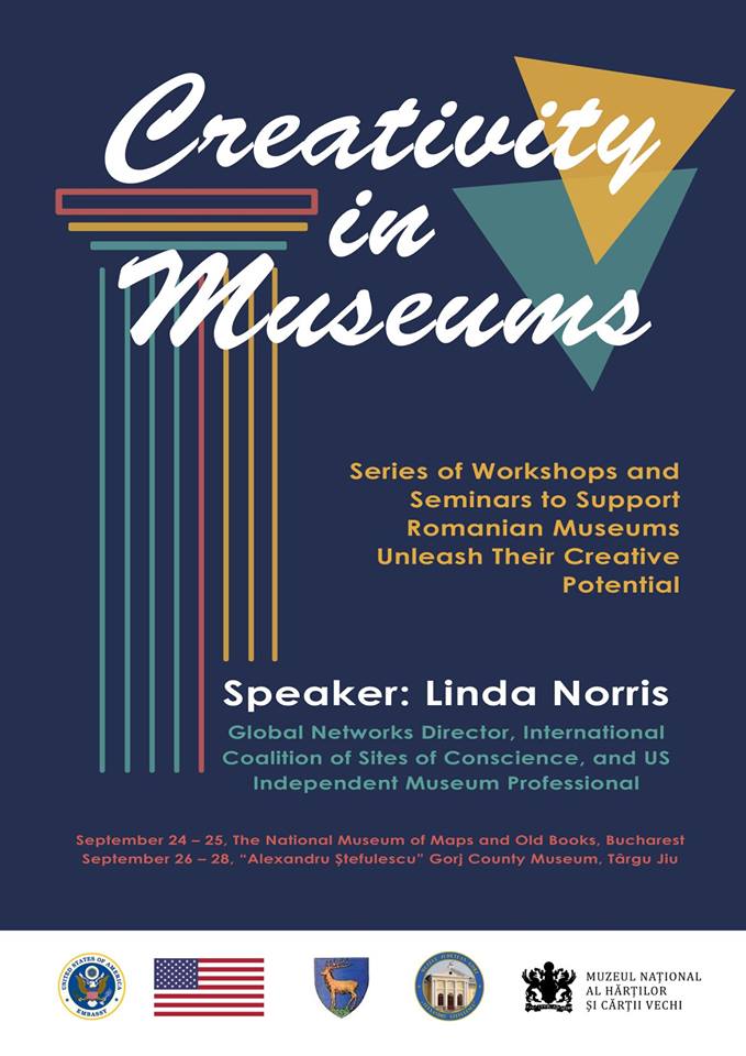 Muzeul Județean Gorj ”Alexandru Ștefulescu”, în parteneriat cu Muzeul Național al Hărților și Cărții Vechi, derulează în perioada 24 – 28 septembrie 2018, proiectul ”Creativitatea în Muzee – Workshop-uri și Seminarii pentru Dezvoltarea Spiritului Creativ al Profesioniștilor din Muzeele Românești”, finanțat de Ambasada SUA la București. Seminariile vor fi ținute de expertul american Linda Norris.