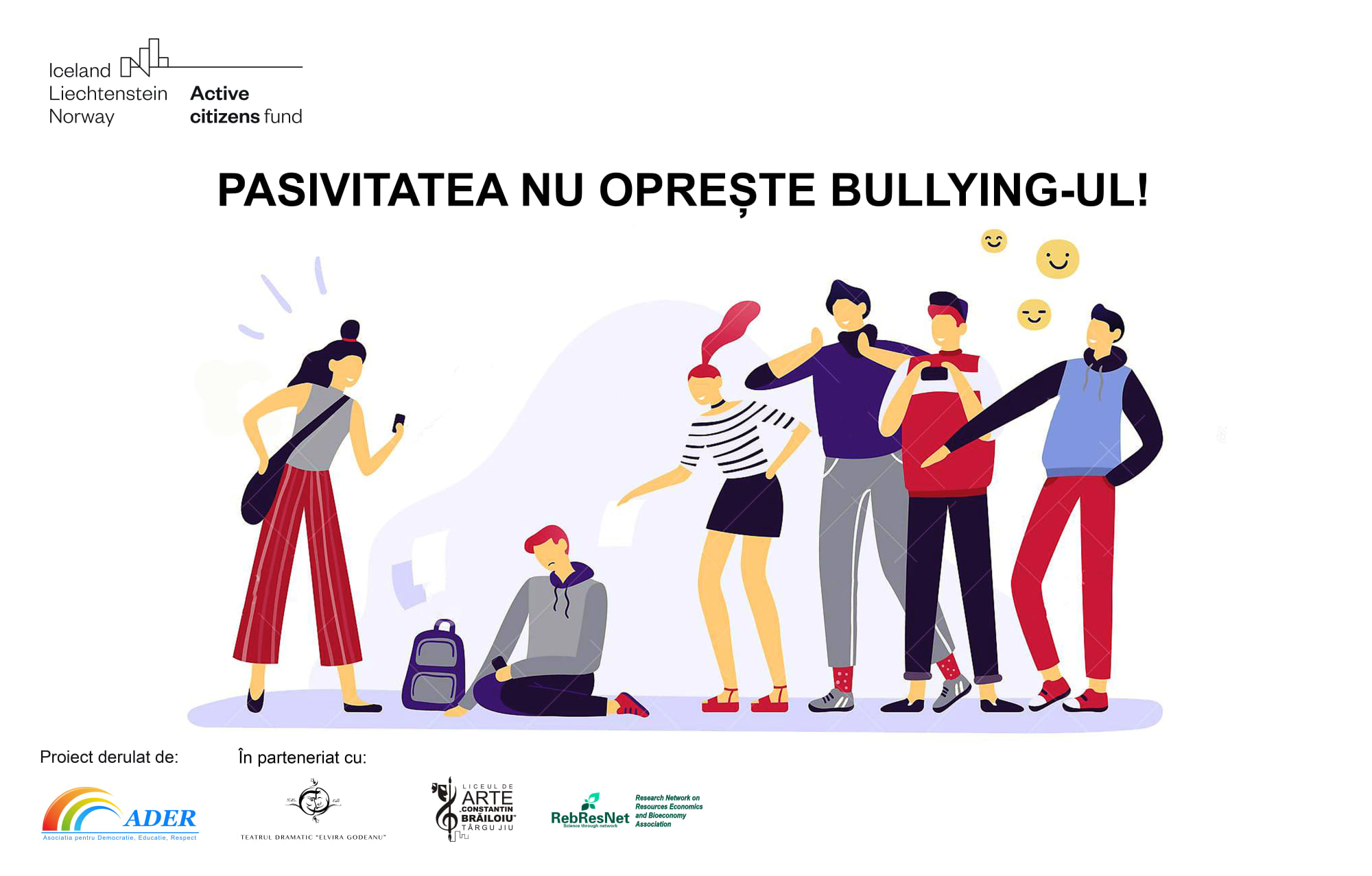 Asociația pentru Democrație Educație Respect va implementa in perioada 11 ianuarie 2021-10 iulie 2021 proiectul ”Pasivitatea nu oprește bullying-ul”. Proiectul se adresează elevilor, profesorilor și părinților din județele Gorj și Prahova și se va derula în parteneriat cu: Liceul de Arte Constantin Brăiloiu din Târgu Jiu, Teatrul Elvira Godeanu din Târgu Jiu și Asociația Research Network on Resources Economics and Bioeconomy din Ploiești.