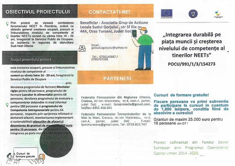 Primarul le transmite că ASOCIAȚIA GRUP DE ACȚIUNE LOCALĂ – SUDUL GORJULUI, în parteneriat cu ASOCIAȚIA FEDERAȚIA PATRONATELOR DIN REGIUNEA OLTENIA (F-PRO) și FEDERAȚIA PATRONATELOR ÎNTREPRINDERILOR DE LA MICI LA MARI F-PIMM implementează proiectul „Integrarea durabilă pe piața muncii și creșterea nivelului de competențe al tinerilor NEETs” ce vizează combaterea fenomenului NEET în România, având ca obiectiv general creșterea ocupării, precum și îmbunătățirea nivelului de competențe al tinerilor NEETs șomeri cu vârsta între 16 – 29 ani.