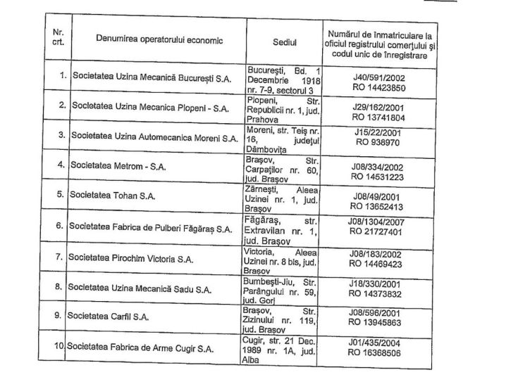 Cele 10 companii care vor avea datoriile șterse sunt: Societatea Uzina Mecanică București S.A, Societatea Uzina Mecanică Plopeni, Societatea Uzina Automecanică Moreni, Societatea Metrom S.A, Societatea Tohan S.A, Societatea Fabrica de Pulberi Făgăraș, Societatea Pirochim Victoria, Societatea Uzina Mecanică Sadu (Gorj), Societatea Carfil, Societatea Fabrica de Arme Cugir.
