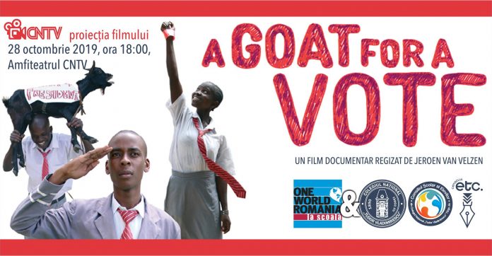 Luni, 28 octombrie 2019, ora 18.00, Colegiul Naţional „Tudor Vladimirescu” Târgu Jiu organizează proiecţia filmului „O capră pentru un vot” – regizat de Jeroen van Velzen, prezentat de One World Romania, un film documentar despre exercitarea democrației, egalitatea de șanse și puterea influenței în politică, toate reflectate în universul unei școli din Kenya în timpul alegerilor unui nou președinte al școlii. Evenimentul va avea loc în Amfiteatrul CNTV Târgu Jiu.