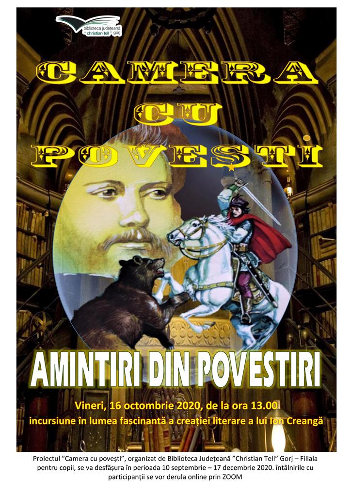 Proiectul ,,Camera cu povești” a demarat în luna septembrie și se va desfășura până pe 17 decembrie. În cadrul acestui proiect au fost organizate deja mai multe întâlniri online, prin ZOOM, întâlniri ce le-au oferit elevilor ocazia de a călători în lumea mai multor opere literare.