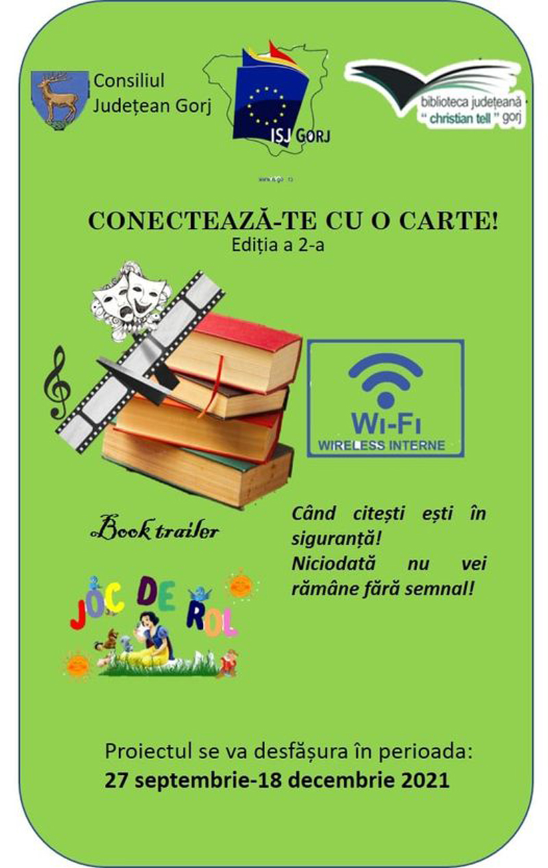 Biblioteca Județeană ,,Christian Tell” anunță o nouă ediție a proiectului ,,Conectează-te cu o carte”. Aceasta se va desfășura în perioada 27 septembrie – 18 decembrie 2021 și se adresează profesorilor și elevilor care iubesc lectura.