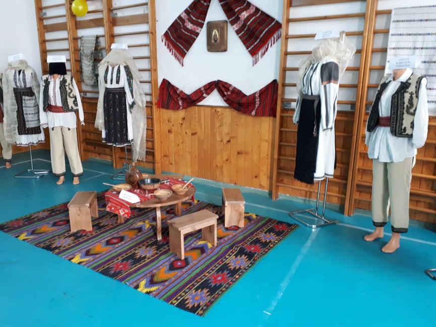 Conducerea școlii ne-a invitat să vizităm o expoziție cu lucrări artistice, machete și panouri dedicate marelui moment istoric, alături de costume populare gorjenești și obiecte tradiționale, organizată în sala de sport din incinta unității școlare. Am făcut și câteva fotografii de grup. Rând pe rând expoziția a fost vizitată și de către elevii școlii.