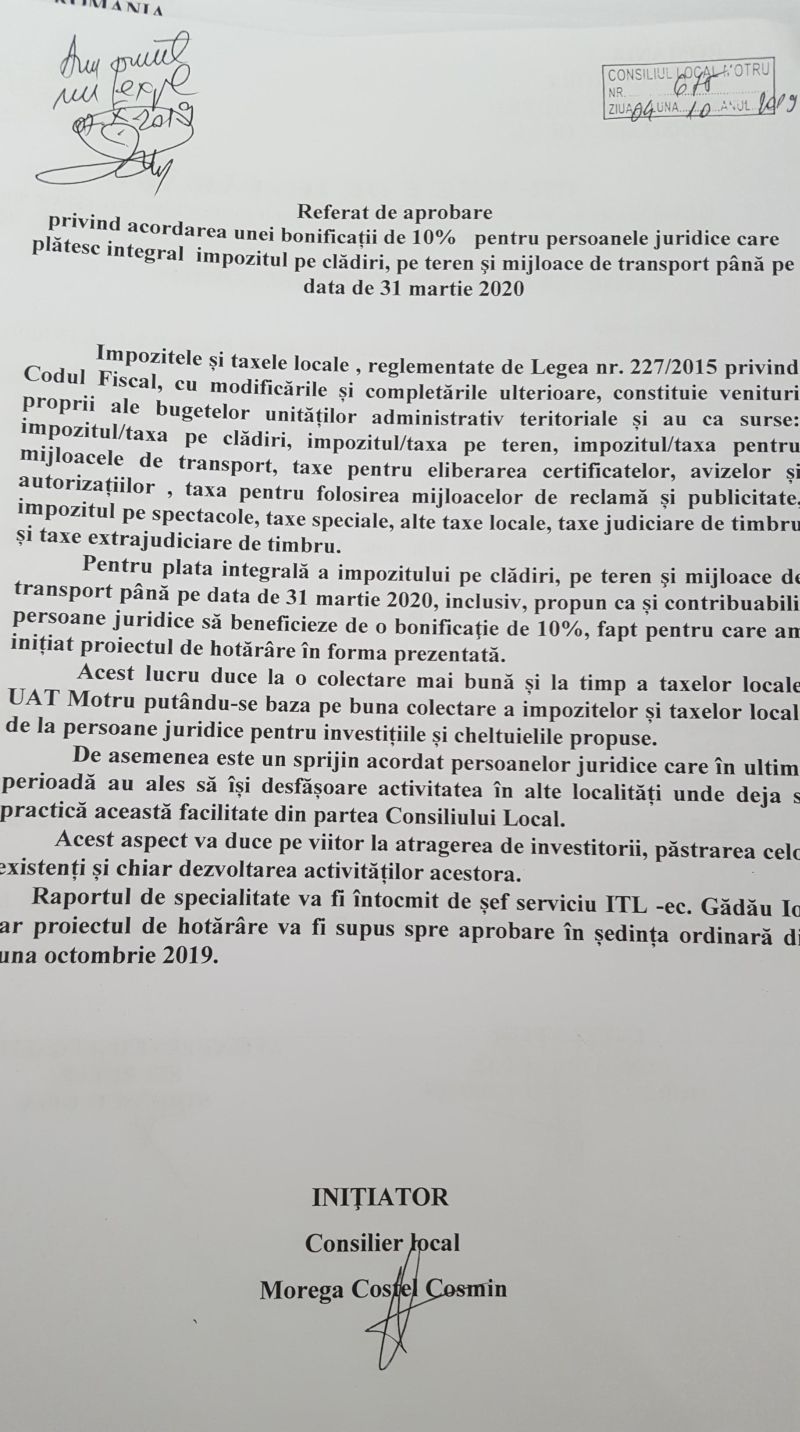 În ultima ședință de CL Motru a fost votat proiectul privind bonificația acordată persoanelor juridice care își achită integral taxele și impozitele la final de martie, inițiat de viceprimarul Cosmin Morega. Proiectul a trecut cu votul a 10 aleși de la PSD, PSRo și ALDE. Împotrivă s-a votat de către aleșii PNL și UNPR, aceștia opunându-se facilităților pentru persoanele juridice ce au ales să părăsească municipiul și să își mute afacerile în alte localități unde se aplică de mult această facilitate.