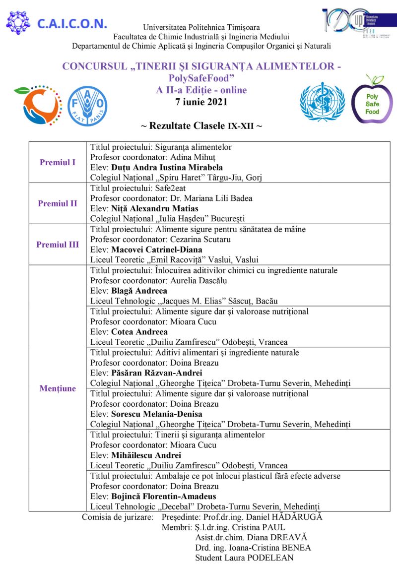 Proiectul ”Siguranța alimentelor”, realizat de Duțu Andra Iustina Mirabela, elevă la Colegiul Național ”Spiru Haret” Târgu-Jiu (prof. coord. Adina Mihuț) a obținut Premiul I la concursul ”Tinerii și siguranța alimentelor – PolySafeFood”, organizat de Facultatea de Chimie Industrială și Ingineria Mediului din cadrul Universității Politehnica Timișoara. Competiția, aflată la ediția a II-a, s-a adresat elevilor claselor V-VIII și IX-XII și studenților din ciclul de studii licență.