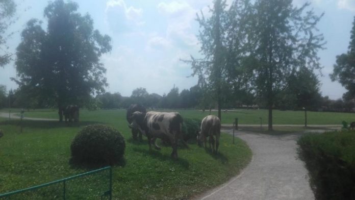 Săptămâna trecută, un consilier local din comuna Fărcăşeşti a publicat pe Facebook poze cu mai multe vaci, care păşteau pe spaţiul verde din Parcul Coloanei fără Sfârşit.