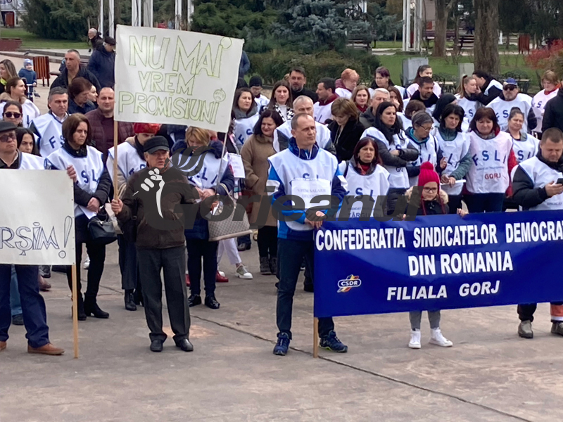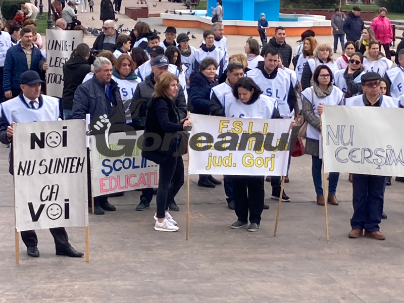 Circa 150 de sindicaliști din învățământul gorjean au protestat ieri, în fața Prefecturii Gorj, față de salariile mici pe care le au aceștia, dar și colegii lor ce fac parte din categoria personalului nedidactic, pentru care lefurile nu au mai fost majorate de ani de zile.