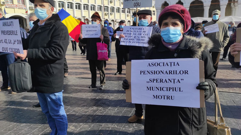 Pensionarilor Gorj poartă pancarte cu mesaje adresate guvernanților. Pensionarii spun că
