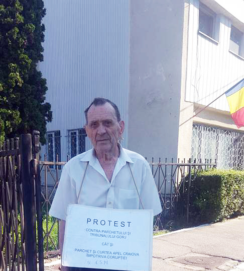 Adrian Gorun, unchiul preşedintelui Senatului Universităţii «Constantin Brâncuşi» din Târgu-Jiu, a protestat, ieri, în fața Parchetului de pe lângă Judecătoria Târgu-Cărbunești. Bătrânul de 90 de ani susține că a recurs la grevă, pentru că este nemulțumit de modul în care procurorii efectuează cercetări, după ce a sesizat că hoții i-au furat hectare întregi de pădure. “Am proces în care Justiția dă verdictul bun, iar procuratura favorizează inculpații. Mi s-au tăiat 30 de hectare de pădure, iar procuratura, în loc să găsească lucrul cel mai bun pentru a-i identifica pe făptași, chiar îi știe și ține la ei. De exemplu, un procuror de la Parchetul de pe lângă Judecătoria Târgu-Cărbunești nu ia măsuri. Am actualmente un proces de dare și primire de foloase, care vizează cinci hectare de pădure”, a declarat pentru Gorjeanul, Adrian Gorun, pensionarul în vârstă de 90 de ani. Acesta a anunțat că va continua protestul până când vor fi prinși infractorii care i-au furat pădurea.