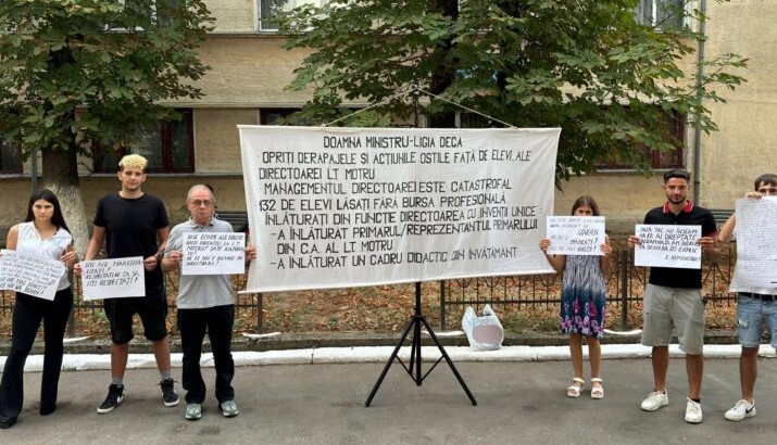 „Doamna ministru Ligia Deca, opriți derapajele și acțiunile ostile față de elevi ale directoarei de la L.T. Motru. Managementul directoarei este catastrofal, 132 de elevi lăsați fără bursa profesională. Înlăturați din funcție directoarea cu invenții unice: a înlăturat primarul/reprezentantul primarului din CA al L.T. Motru; a înlăturat un cadru didactic din învățământ”, scrie pe pancarta protestatarilor.