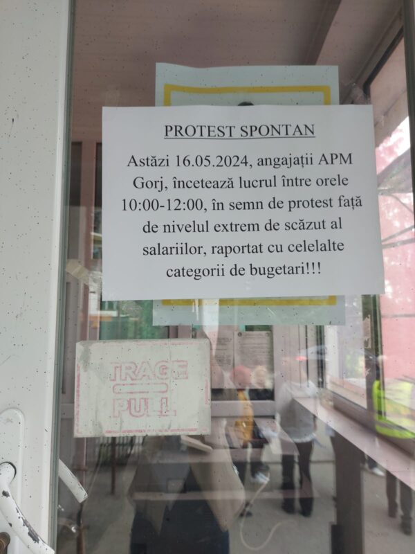 Salariații de la Agenția pentru Protecția Mediului Gorj au ieșit astăzi în stradă. Protestul spontan este declanșat la nivel național, în special de sindicatele agențiilor de protecția mediului afiliate la PUBLISIND. Angajații APM Gorj se află acum, cu pancarte, în fața sediului instituției.