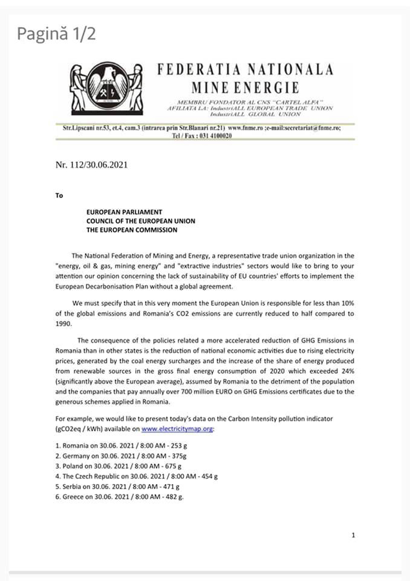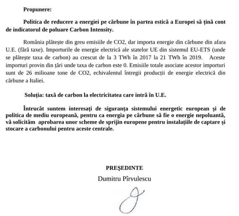 FNME, federație condusă de Dumitru Pîrvulescu, a trimis, la rândul ei, o adresă organismelor europene și cere în clar scheme de sprijin europene pentru instalațiile de captare și stocare a carbonului pentru termocentrale: