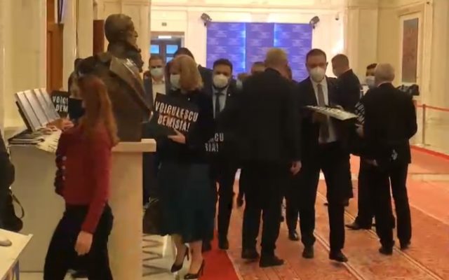Parlamentarii au purtat pancarte negre cu mesajul ”Voiculescu – Demisia”.