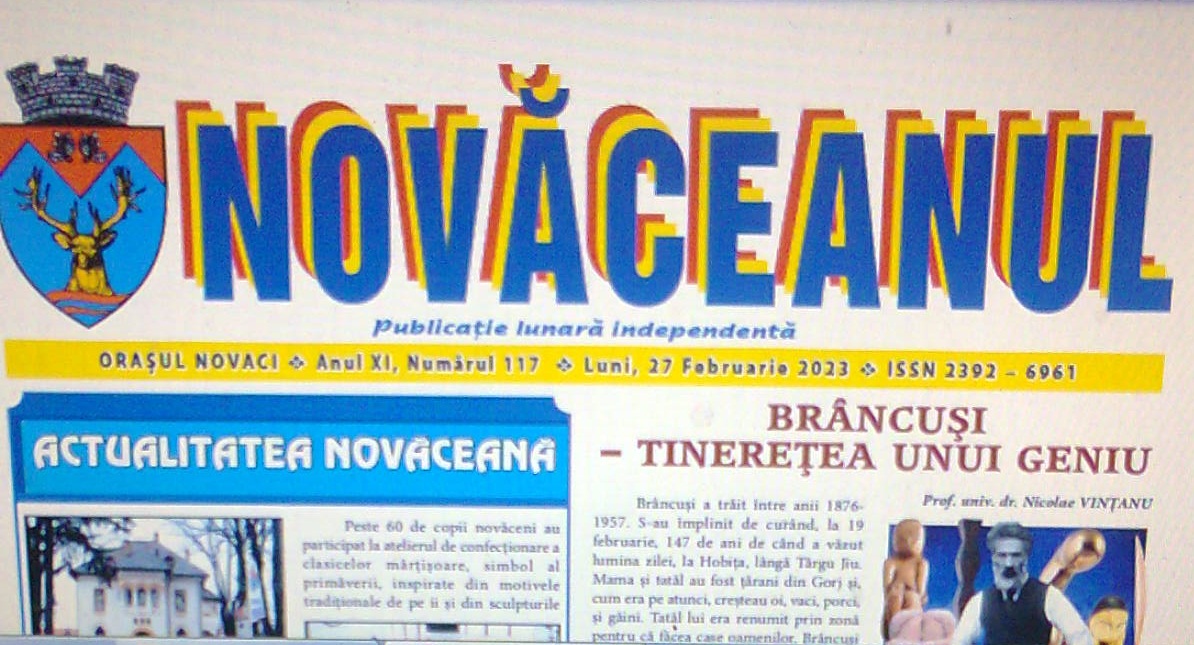 Publicaţie lunară independentă şi de mare prestigiu care se exprimă prin tinereţea celor 11 ani de apariţie neîntreruptă şi prin calitatea materialelor prezentate în paginile sale, «NOVĂCEANUL» Nr. 117 se prezintă, astăzi, în veşmintele imaculate ale anotimpului, cu o zestre bogată de articole consacrate marelui sculptor Constantin Brâncuşi, de la naşterea căruia s-au împlinit la 19 februarie, 147 de ani de când a văzut lumina zilei în satul Hobița, comuna Peştişani, tatăl său fiind renumit prin zonă, pentru că făcea case oamenilor, iar, tânărul Brâncuși umbla cu oile. Cu neastâmpărul geniului, de multe ori făcea tot felul de lucruri ciudate și învățase de timpuriu să cânte la vioară. După multe peregrinări prin ţară, când a ajuns şi a lucrat la Paris, în atelierul său și-a construit două viori la care cânta doine de pe la noi din Gorj. Se spune că din fragedă pruncie, cel mai mult se uita la pietrele din fața casei, și nu se gândea pe atunci că o să sculpteze chipuri de oameni, cocoșul care cântă, păsări măiestre sau un Ansamblu monumental care să uimească lumea cu tot ceea ce înseamnă minunile sculpturii moderne! În momentul în care am primit exemplarul ultimului număr al publicaţiei, cu aleasă gratitudine, prin cuvinte bine cumpănite şi alese cu atenţie, dl prof. Constantin Dârvăreanu mi-a spus cu sinceritate: ,,Mulţumim conducerii Ziarului «Gorjeanul» pentru sprijinul acordat publicaţiei noastre”!