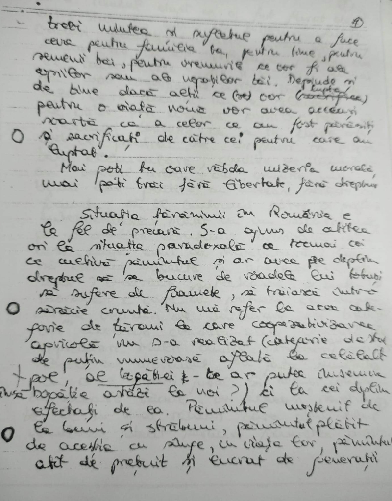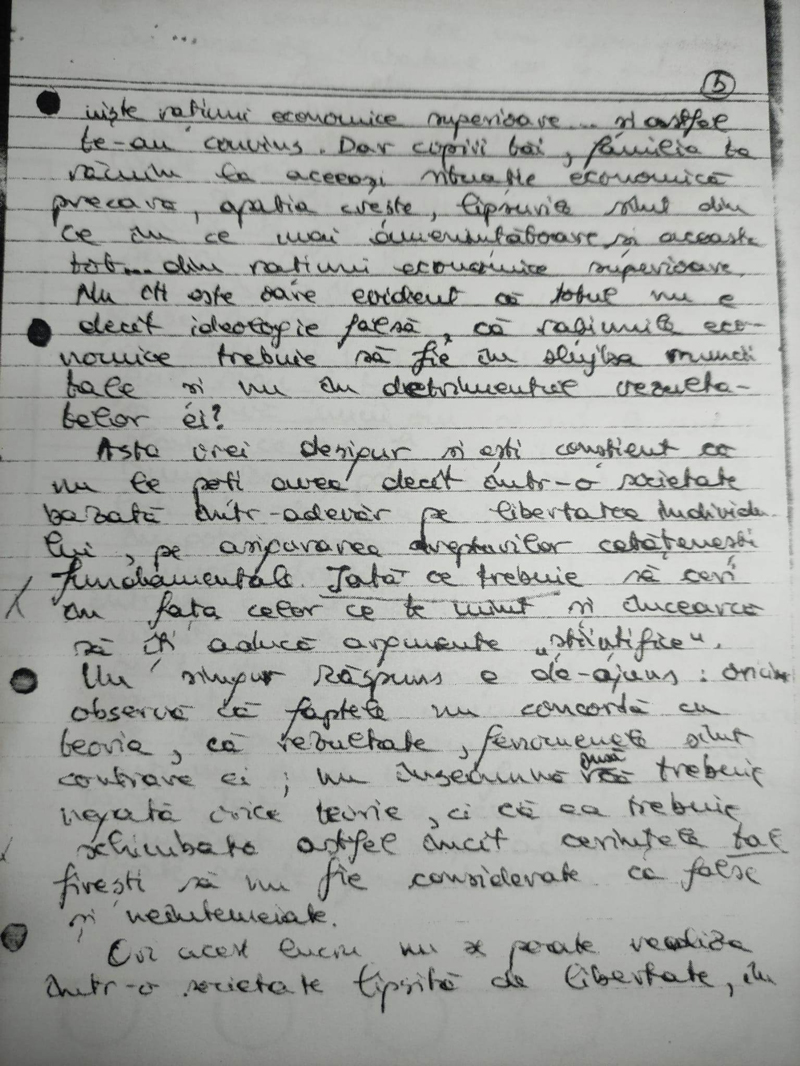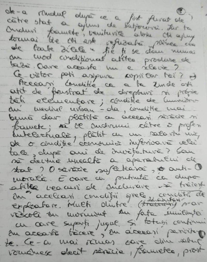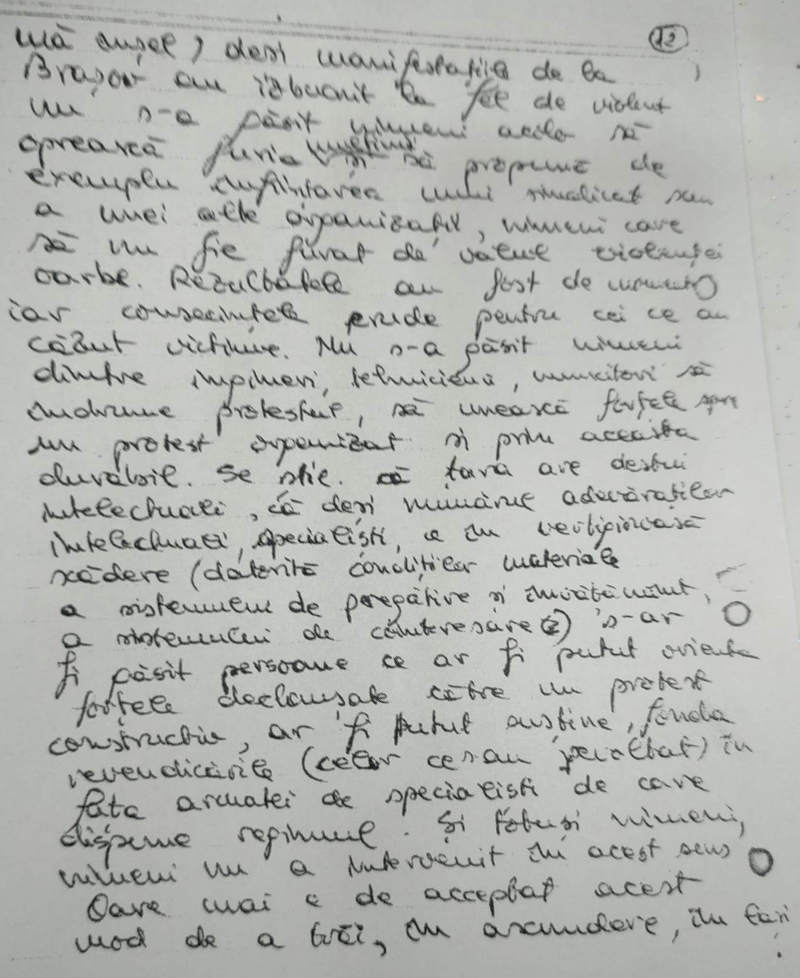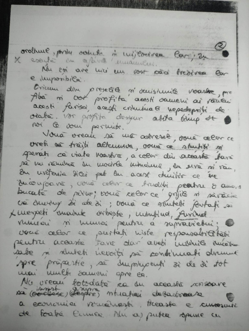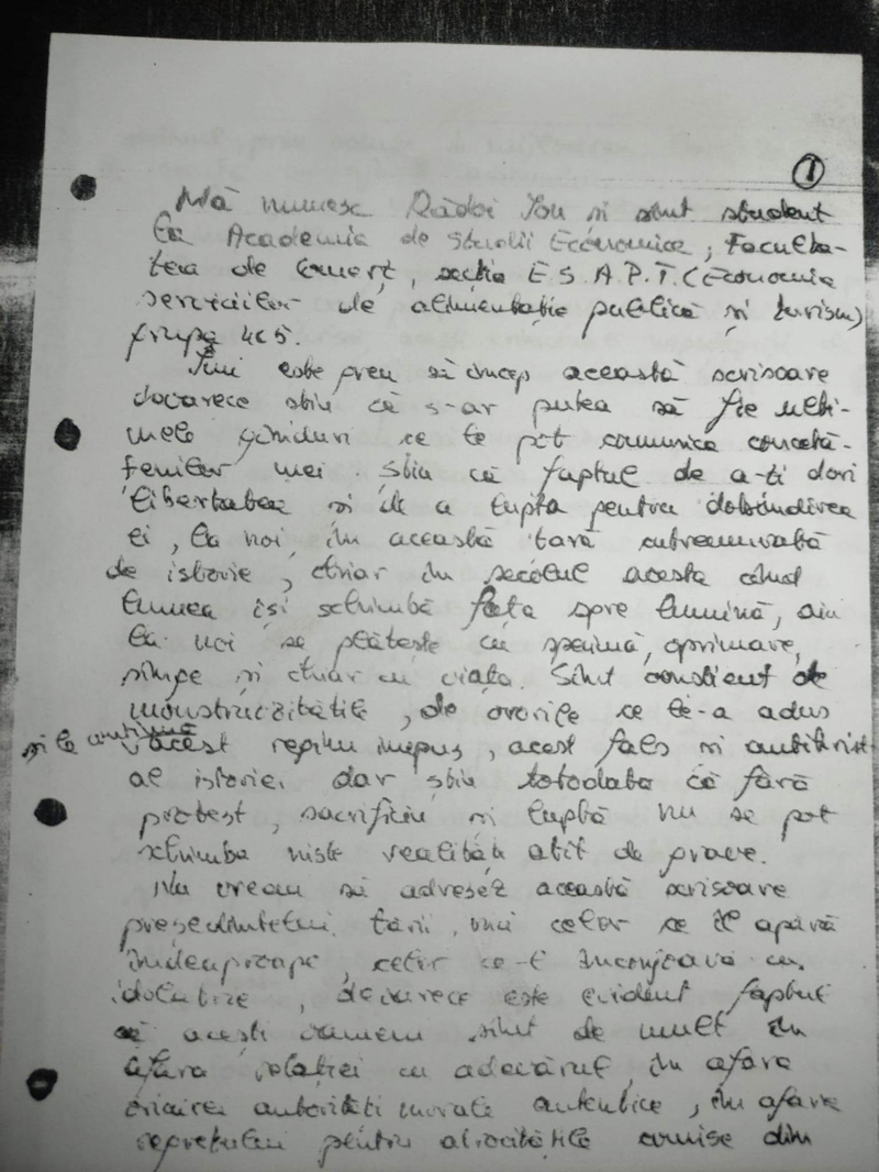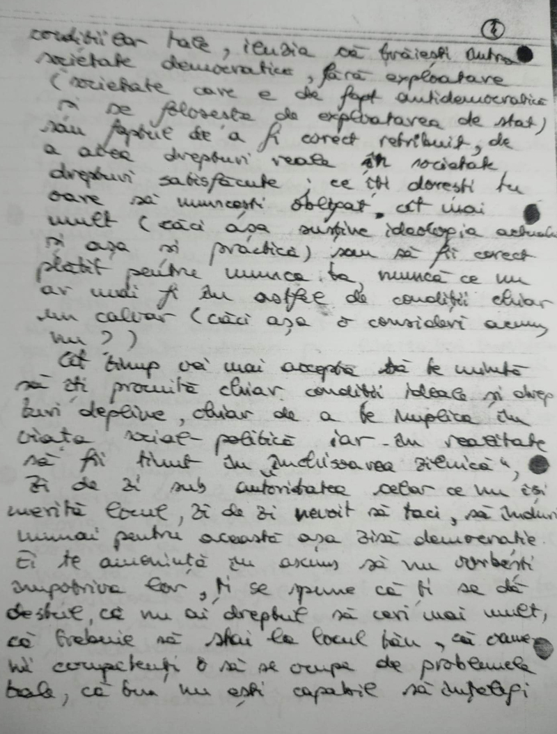 Zilele până la schimbarea situației politice la noi sunt numărate. Timpul unei adevărate Revoluții române e aproape. Timpul când vom refuza să mai fim sclavi, să mai trăim în această închisoare și nu într-o țară liberă, acest timp se întrevede de sufletul oricărui suferind. Lucrați, vă rugăm, pentru a ne apăra, faceți-o într-adevăr și nu-l ocrotiți pe dictator!