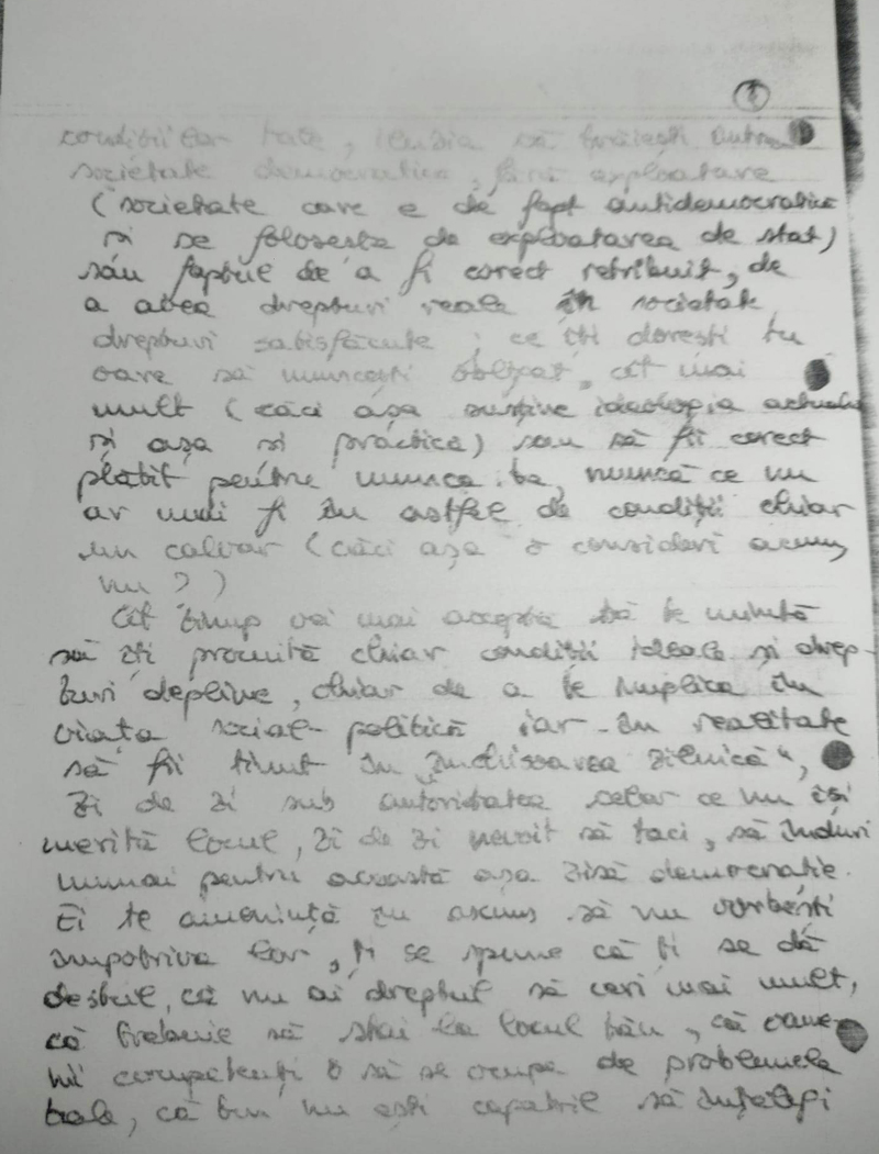Oare ce îți dorești tu, falsitatea declarațiilor oficiale sau autenticitatea faptelor, implicarea ne-competentă în discuții, în interminabilele ședințe sau dreptul la a protesta și activa pentru îmbunătățirea condițiilor tale, iluzia că trăiești într-o societate democratică, fără exploatare, (societate care e de fapt anti-democratică și se folosește de exploatarea de Stat) sau faptul de a fi corect retribuit , de a avea drepturi reale în societate, drepturi satisfăcute; ce îți dorești tu oare, să muncești obligat cât mai mult (căci așa susține ideologia actuală și așa și practica) sau să fii corect plătit pentru munca ta, muncă ce nu ar mai fi în astfel de condiții chiar un calvar ( căci așa o consideri acum, nu?)
