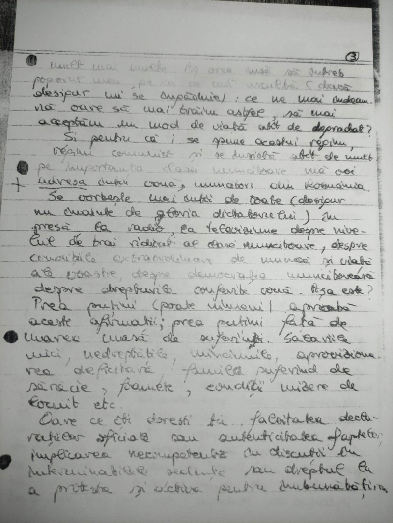 Se vorbește mai întâi de toate (desigur nu înainte de gloria Dictatorului) în presă, la radio, la televiziune despre nivelul de trai ridicat al clasei muncitoare, despre condițiile extraordinare de muncă și viață ale voastre, despre democrația muncitorească, despre drepturile conferite vouă. Așa este? Prea puțini (poate nimeni) aprobă aceste afirmații; prea puțini față de marea masă de suferinzi.