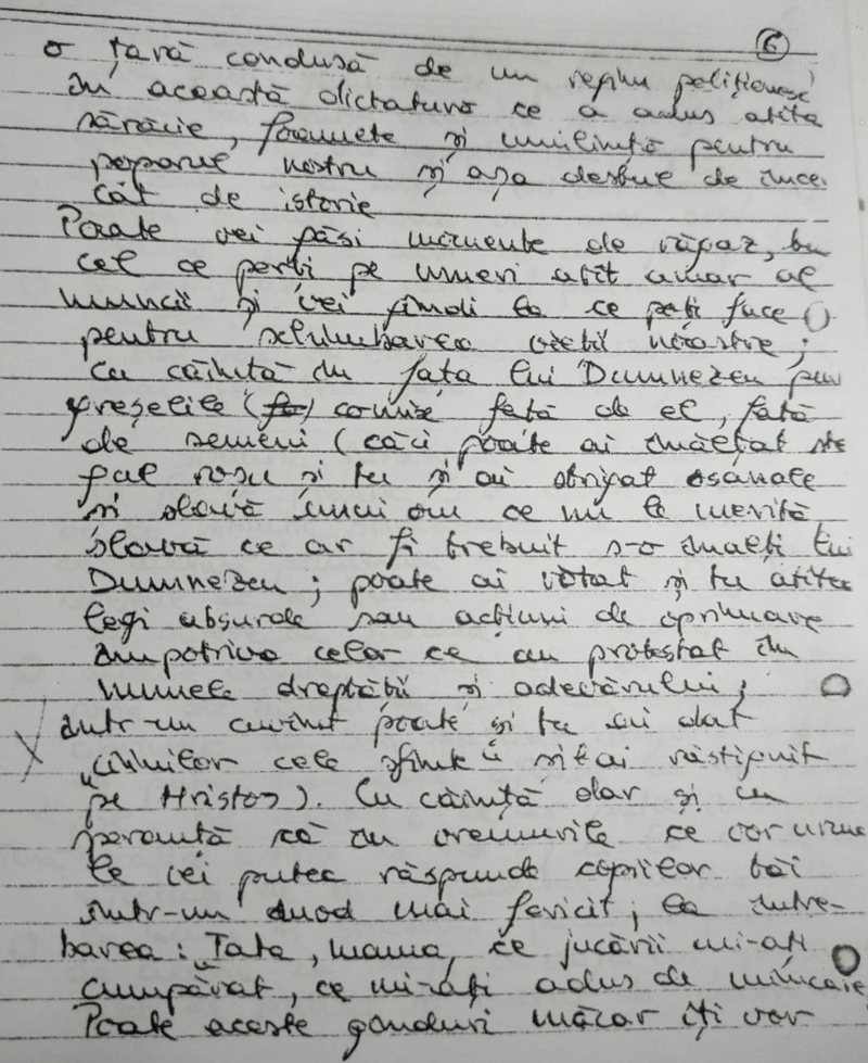 Am renunțat voit la cenzurarea gândurilor și sper că am reușit să fiu bine înțeles. Sper ca suferințele mele ce vor urma să nu fie degeaba, sper ca ele să-și găsească rodul în voi, în faptele viitoare. Aș fi putut să aleg multe alte căi prin care aș fi avut o viață ușoară, îndestulată, mulțumitoare. N-aș fi avut însă credință, libertate și Dumnezeu. Înainte de despărțire (poate definitivă, cine știe?) , îngăduiți-mi să rostesc o rugăciune, pentru noi toți cei ce încă mai supraviețuim în această țară, pentru frații de dincolo care odată, poate vor fi așteptați cu flori să se întoarcă acasă, pentru voi toți cei ce vor să audă: