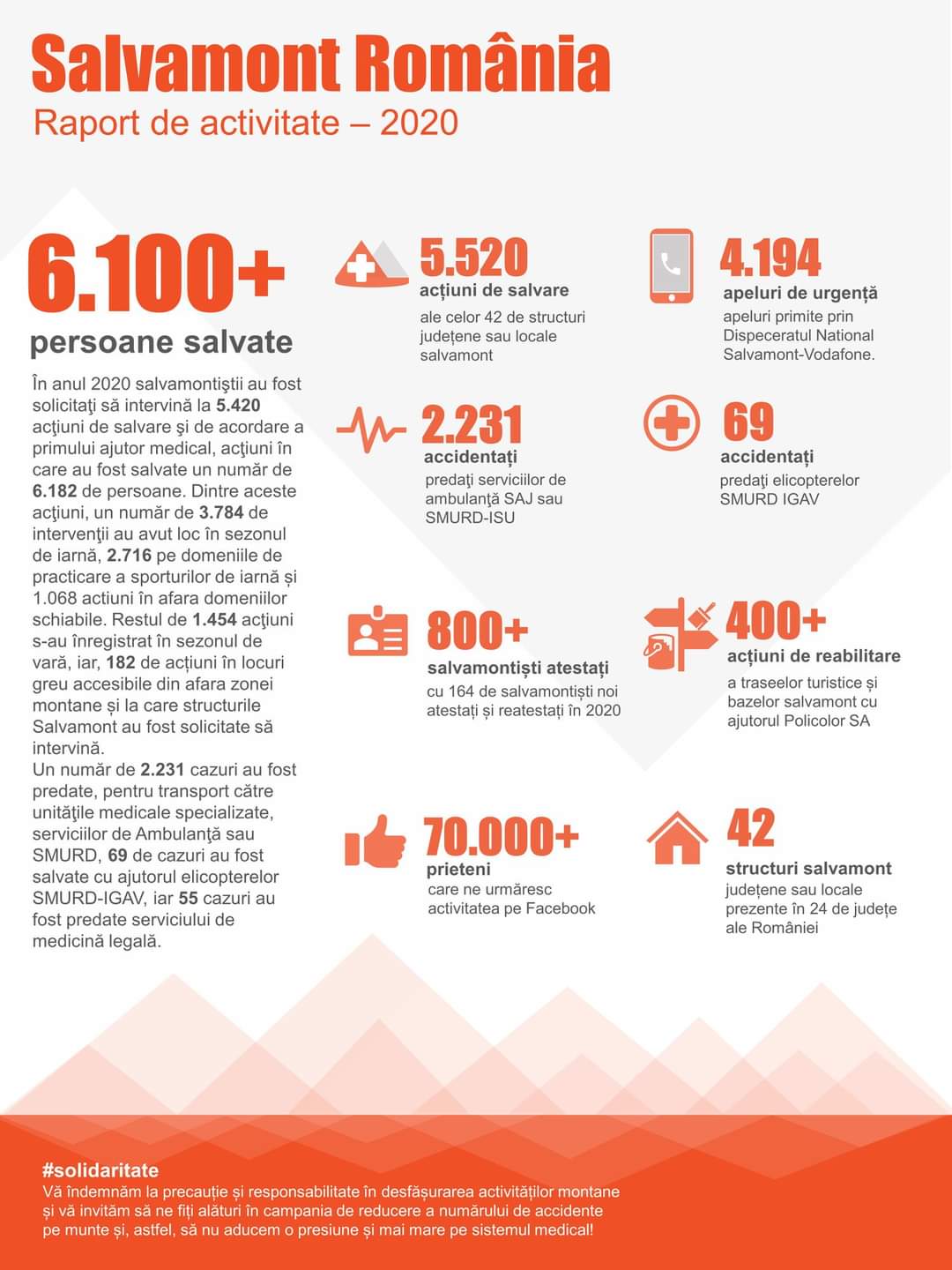 Asociația Națională a Salvatorilor Montani din România și Consiliul Serviciilor Publice Salvamont au centralizat activitatea celor 42 de structuri județene sau locale Salvamont din cele 24 de județe cu activitate de salvare montană din România pentru anul 2020, activitate influențată direct de perioada de pandemie, atât ca și adaptare a procedurilor de intervenție cât și de gestionare a unui aflux ridicat de turiști către zona montană.