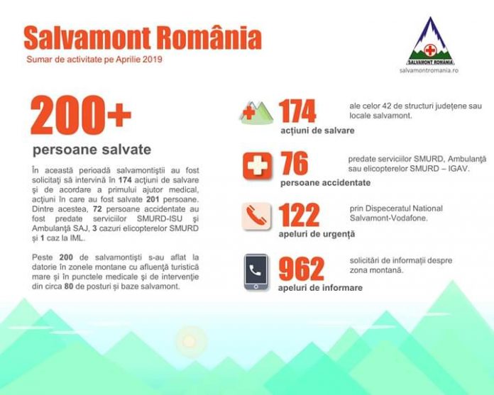 Asociaţia Naţională a Salvatorilor Montani din România (A.N.S.M.R.) şi Consiliul Serviciilor Publice Salvamont au centralizat activitatea, pentru luna aprilie, a celor 42 de structuri județene sau locale salvamont din cele 24 de judeţe cu activitate de salvare montană din România.