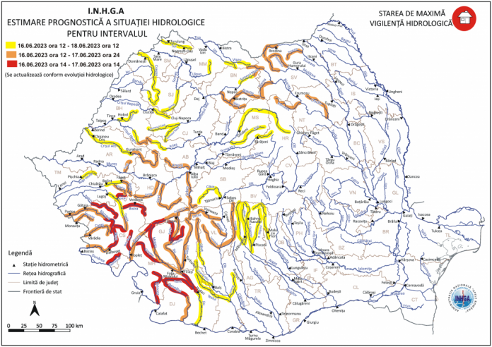 În intervalul 16.06.2023 ora 12:00 – 18.06.2023 ora 12:00 pe râurile din bazinele hidrografice: Vişeu – bazin superior şi afluenţi bazin mijlociu şi inferior, Iza – bazin superior şi afluenţi bazin mijlociu şi inferior, Lăpuş – bazin superior şi afluenţi bazin mijlociu şi inferior (judeţul Maramureş), Tur (judeţul Satu Mare), Someşul Mare – bazin superior şi afluenţi bazin mijlociu şi inferior (judeţul Bistriţa Năsăud), Someşul Mic – bazin superior şi afluenţi bazin mijlociu şi inferior (judeţele: Bihor şi Cluj), Someş – afluenţii mici aferenţi sectorului aval S.H. Dej (judeţele: Cluj, Sălaj, Maramureş şi Satu Mare), Crasna (judeţele: Sălaj şi Satu Mare), Barcău – bazin superior şi afluenţi bazin mijlociu şi inferior (judeţele: Sălaj şi Bihor), Crişul Repede – bazin superior şi afluenţi bazin mijlociu şi inferior (judeţele: Cluj şi Bihor), Crişul Negru – bazin amonte S.H. Beiuş şi afluenţii aferenţi sectorului aval S.H. Beiuş (judeţele: Bihor şi Arad), Crişul Alb (judeţele: Hunedoara şi Arad), Mureş – bazin amonte S.H. Glodeni, Niraj (judeţele: Harghita şi Mureş), Arieş – bazin amonte S.H. Baia de Arieş şi afluenţii aferenţi sectorului aval S.H. Baia de Arieş (judeţele: Alba şi Cluj), Mureş – afluenţii aferenţi sectorului aval confluenţă cu râul Arieş – amonte confluenţă cu râul Târnava (judeţele: Alba şi Cluj), Târnava Mică – bazin superior şi afluenţi bazin mijlociu şi inferior (judeţele: Harghita, Mureş şi Alba), Mureş – afluenţii aferenţi sectorului aval confluenţă cu râul Târnava (judeţele: Alba, Hunedoara, Sibiu şi Arad), Bega Veche – bazin superior şi afluenţi bazin mijlociu şi inferior, Bega – bazin amonte S.H. Balinţ şi afluenţii aferenţi sectorului aval S.H. Balinţ – amonte S.H. Remetea (judeţul Timiş), Timiş – bazin amonte S.H. Lugoj, Pogăniş – bazin amonte Ac. Cadar Duboz, Bârzava, Moraviţa (judeţele: Caraş Severin şi Timiş), Caraş, Nera (judeţul Caraş Severin), Cerna (judeţele: Gorj şi Caraş Severin), Dunăre – afluenţii mici aferenţi sectorului amonte confluenţă cu râul Desnăţui (judeţele: Dolj, Mehedinţi şi Caraş Severin), Desnăţui (judeţele: Mehedinţi şi Dolj), Jiu (judeţele: Hunedoara, Gorj, Mehedinţi şi Dolj), Olt – afluenţii aferenţi sectorului aval S.H. Sebeş Olt (judeţele: Sibiu, Vâlcea, Gorj, Argeş, Olt şi Dolj), Argeş – bazin superior (judeţul Argeş), Dâmboviţa – bazin superior (judeţele: Argeş şi Dâmboviţa), Suceava – bazin superior şi afluenţi bazin mijlociu şi inferior (judeţul Suceava), Moldova – bazin superior şi afluenţi bazin mijlociu şi inferior (judeţele: Suceava şi Neamţ), Bistriţa – bazin amonte S.H. Cârlibaba şi afluenţii aferenţi sectorului aval S.H. Cârlibaba – amonte S.H. Frunzeni (judeţele: Suceava, Neamţ şi Harghita).